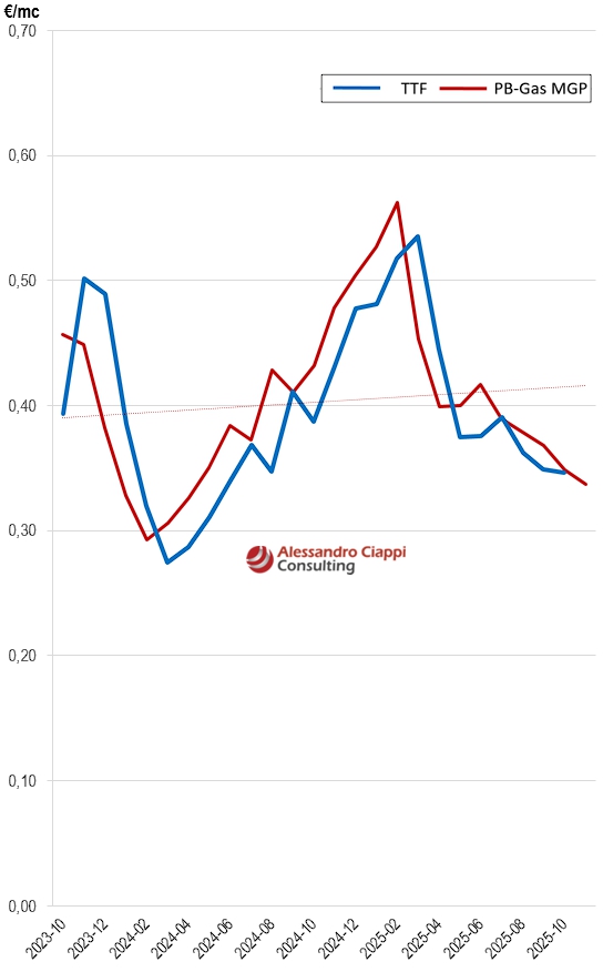 Commento:Nell’ultimo trimestre il PUN si mantiene sostanzialmente costante, con una lieve tendenza al rialzo. In Ottobre chiude con una media mese di 111,04 €/MWh (+1,8% vs settembre); i motivi sono l’incremento dei consumi in autunno rispetto ai mesi estivi, pur restando su livelli contenuti mentre sul fronte gas, utilizzato nella generazione, i livelli di stoccaggio oltre l’80% hanno ridotto i rischi di tensioni, favorendo un quadro di equilibrio.Novembre conferma l’andamento degli ultimi mesi con un PUN a metà mese di 111,78 €/MWh sostanzialmente immutato rispetto ad ottobre (+0,7%)17/11/2025